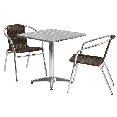 Create an enjoyable dining experience with this table set that will enhance your bistro, cafe, restaurant, hotel or home patio space. The designer style stainless steel table top features a smooth surface for keeping items level. The column and base are constructed of lightweight aluminum material. The chair is lightweight and easy to move and store. For easy storing and cleaning purposes these chairs stack up to 20 chairs high. This set was designed for all-weather use making it a great option for indoor and outdoor settings. For longevity, care should be taken to protect from long periods of wet weather. Whether you are just starting your business or upgrading your furniture this set will complete the look. Additional Features: Integrated Arms, Cross Braces provide extra stability, Aluminum Frame, Plastic Floor Glides, Chair Size: 21.75″W x 22″D x 29″H