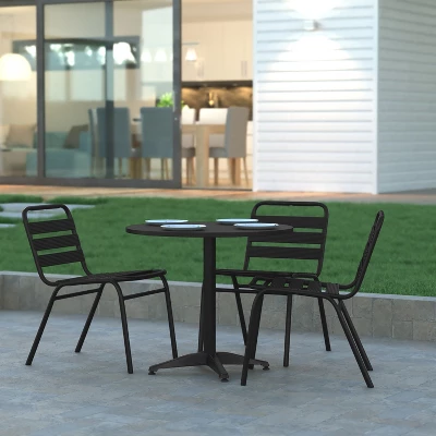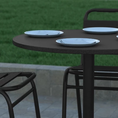 Whether you need to add more seating space or create an intimate conversation area, this versatile round table is up to the task. Enhance the look of your bistro, cafe, restaurant, hotel or home patio space without taking up too much real estate. The designer style stainless steel table top features a smooth surface for keeping items level. The column and base are constructed of lightweight Metal material making it easy to move this table wherever you need it. Designed for all-weather use, this table is a great option for indoor and outdoor settings. For longevity, care should be taken to protect from long periods of wet weather. Whether you are just starting your business or upgrading your furniture this table is a wise investment.