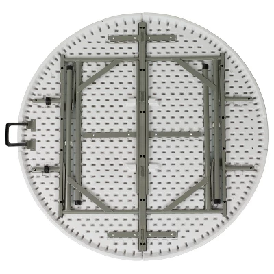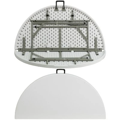 Say hello to the perfect solution for your seating crisis! This bi-fold round dining folding table is a great option for special event planners, catering companies and banquet facilities. This durable, easy to clean table is rated for commercial use in banquet halls, convention centers and at trade shows. Use during game night, dress it up for holiday parties, and coordinate crafts night. The granite white tabletop is 4′ in diameter, 1.75″ thick, and will comfortably seat up to 4 adults. Its waterproof, impact and stain resistant top have a 440 pound static load capacity. Attractive gray powder coated legs lock securely in place while in use and non-marring floor caps protect your floor by sliding smoothly when you need to move the table. The table folds in half, making it easy to store and transport, using the convenient carrying handle attached on the side. When using for outdoor events store indoors to protect the frame from extreme moisture. Additional Features: Folds in half for storage and travel, Includes convenient carrying handle, Gray Powder Coated Locking Legs with protective floor caps, Legs fold underneath top for flat storage, Designed for Indoor and Outdoor Use