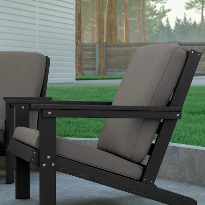 Relax poolside or on your deck or patio with this beautiful and comfortable deep seated adirondack chair with cushions. Durably constructed from polyresin for natural weather resistance with steel screws for stability and strength capable of supporting up to 300 lbs. of static weight. The contoured design features a deep seat and a tall, breathable slatted back to let you relax and stretch out, while comfortable armrests offer additional support and a place to set your drink or phone. The thickly padded seat and back cushions feature a weather-resistant outer covering. Assembly is a breeze to complete in 30 minutes with the included hardware and instructions. For low maintenance upkeep, simply wipe clean with a damp cloth or remove and hand wash the cushion covers for a deeper clean. Pair with the matching loveseat and table or add more chairs to create a beautiful custom seating arrangement.