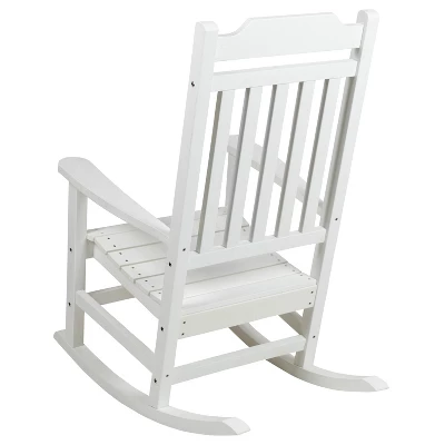 Take a break from your day and hang out on your front porch, patio or deck in this all-weather black poly resin rocking chair. No matter your decorating style, the traditional slat back and seat design give a classic but on-trend look to this colorful rocking chair. The full-back design will support you in all the right places while the sloping runners provide smooth rocking motion to keep you cozy and relaxed. This indoor/outdoor rocking chair is made of long-lasting durable polystyrene so there is no warping, rotting or chipping and no back breaking sanding and staining necessary to keep this chair looking great. Mortis and tenon construction with metal screw reinforcements will hold up to 225 pounds weight capacity and ensure you have a comfortable, worry free seating experience. This porch rocking chair is weather and rust resistant to stand up to the elements. Minimal assembly is required and the tools are included so you can enjoy your new rocker chair in 30 minutes or less. Take care of pesky dirt or spills easily with water and a neutral detergent. Buy a pair of these rocking chairs to form a cozy conversation area or pair several with one of our outdoor patio heaters or wood burning fire pits and make backyard memories with friends and family.