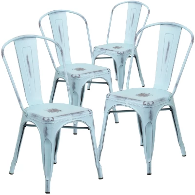 Spice up your kitchen or dining room by adding this colorful metal chair to your dining table. This metal dining chair pairs nicely with not only metal tables but also with glass and wood dining tables. Whether your home decor is shabby chic, traditional or industrially styled, you’ll be surprised how easily this stackable metal chair will blend with your existing decor. Bistro chairs add a trendy old-world look to your restaurant and will add some color to your employee breakroom furniture. These cool colorful chairs can be enjoyed by everyone, high school and college students love to see trendy furniture used in their schools. The distressed metal chair features a curved back with a vertical slat along with a stabilizing cross brace. Your colorful dining chair will last longer thanks to the plastic bumper guards that protect the chairs’ finish when stacked. While being used outside on the deck, pool or patio, you’ll be delighted to find that these outdoor stacking chairs include drain holes to prevent pooling in the center of the seat. This translates to quicker seating turnaround times in your busy establishment. This trend-setting indoor outdoor dining chair will make a great addition to your kitchen, dining room or restaurant. Mix and match colors to make your dining room and outdoor living space pop with color. For longevity, care should be taken to protect from long periods of wet weather.