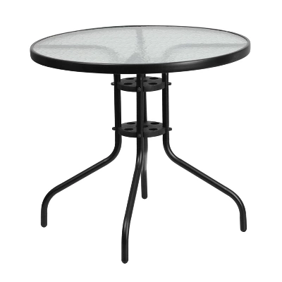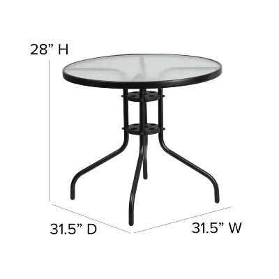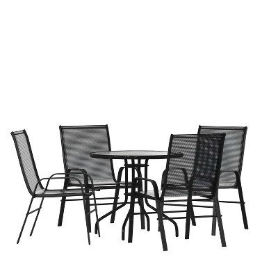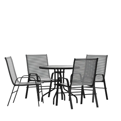 Get the most out of your outdoor space with this five piece patio dining set. A spacious 31.5″ round table with a metal frame and tempered glass top provides the perfect space for outdoor dining or card games. The smooth textured top features a designer rippled effect for an elevated look. Four flex comfort sling style chairs give each of your guests the most comfortable seat in the house and are upholstered in brown textilene fabric for breathable, supportive comfort. When not in use, the chairs can stack up to four high for easy storage. The integrated umbrella hole is perfect for pairing with one of our 9′ round UV resistant patio umbrellas to shade you from the sun and protect your furniture set from rain. The all weather materials are designed to last and for longevity, the set should be protected from prolonged exposure to excessive moisture.