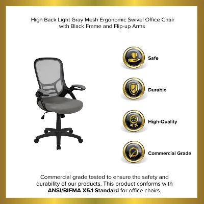 Fall into comfort on this ultra-padded swivel office chair that’ll add personality to your home office or professional office space. Put that old chair to rest, having the support of an ergonomic office chair will help improve your attitude when you no longer must sit in discomfort. This modern office chair is equipped with a lever to control the seat height and activates the seat recline. Mesh office chairs are popular due to their ventilated mesh material that allow air to circulate to your back, keeping you cool and calm. Paired with a contoured padded seat with pressure relieving waterfall edge and a high back this executive office chair will integrate into any space. If you like working with your chair raised high a flip-up arm chair is perfect allowing you to flip the arms upward like an armless chair while pulling yourself close to your desk. You’ll have no problem taking charge of your workday perched on this high back ergonomic office chair with flip-up arms. You’ll wish you had purchased this chair sooner, whether as a personal purchase or to accommodate your entire staff. Additional Features: Waterfall Seat reduces pressure on your legs, Contoured Mesh Upholstered Seat with CAL 117 Fire Retardant Foam, Pneumatic Seat Height Adjustment, 5-Star Nylon Base with Dual-Wheel Casters
