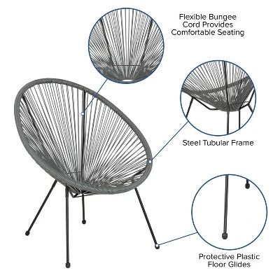 Have fun and relax with flair in this black woven basket papasan lounge chair that provides comfort with a standout, stylish appearance. The oval shaped opening beckons you to sink in while rattan and steel material provide durability to hold up throughout the years. Plastic floor glides will protect your interior floors and these chairs can be stacked for high making storage a breeze. Lounge in the comfort of your home or on the patio on a warm and sunny day and add some fresh, cool pillows for a style punch. Clean up spills with a solvent and water-based cleaner such as foam to keep this chair looking great. For longevity, care should be taken to protect from long periods of direct sunlight and wet weather.