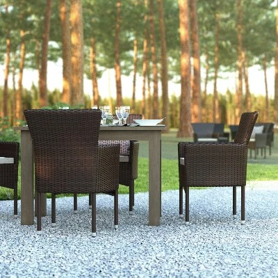 Update your porch, patio, deck or sunroom with this set of four woven patio chairs. The modern design is beautifully accentuated by the black finished woven rattan wicker. The durable, powder coated steel frame features welded joint construction for dependable strength and is weather and rust resistant for longevity, making it perfect for use outdoors. The 350 lb. weight capacity gives you peace of mind knowing all of your guests will have safe seating. A removable gray cushion adds padded comfort to the deep seat and plastic glides protect your flooring surfaces from damage when used indoors. Your chairs ship preassembled and ready for use and wipe clean with a damp cloth.