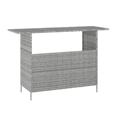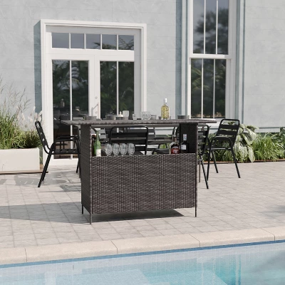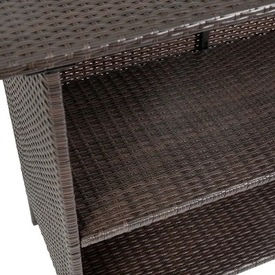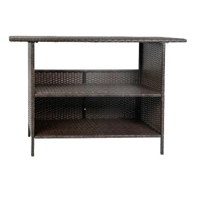 Tend to your guests and upgrade your space’s style all at once with this indoor/outdoor wicker rattan patio bar counter table. This simple yet chic choice comes equipped with ample storage space thanks to an inner shelf and spacious bar top. The woven wicker rattan structure is UV-resistant and built for all weather conditions, meaning you can add this to any indoor or outdoor space with confidence. A rust-resistant powder coated metal frame is built with lasting durability in mind so you can serve dinner, drinks, and appetizers in style on your patio, by the pool, in your dining room, or wherever you and your guests are gathering. This table holds up to 200 lbs. static weight, while the shelf holds up to 50 lbs. static weight. Fixed plastic floor glides are equipped to prevent damage to your hard floors. Plus, this table is counter bar height, meaning it will pair perfectly with your favorite barstools or chairs for a complete look. Assembly is quick and easy, typically taking under ten minutes, and this table can be cleaned with just a neutral cleaner and water. Elevate your space and make a statement at every opportunity to host with this indoor/outdoor wicker rattan bar counter table.