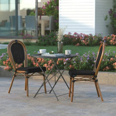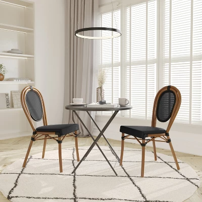 Bring the street vibes of Paris right into your restaurant, bistro, hotel, or backyard patio with this indoor/outdoor commercial grade bistro chair. The durable PE rattan Thonet-style back and seat are very comfortable and won’t fade when used outdoors. The lightweight, but sturdy, powder coated metal frame boasts a black finish, holds up to 400 lbs. static weight, and will not rust. Recommended stack height for this chair is up to 5 high for storage or transport. Two curved arms deliver additional comfort and structure. For your convenience, this chair arrives completely assembled for instant use and features floor protector glides to prevent damage to indoor hard flooring surfaces. This dining chair easily wipes clean with a damp cloth for quick seating turnaround.