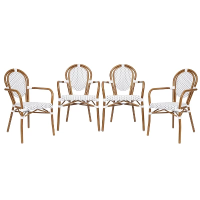 Bring the street vibes of Paris right into your restaurant, bistro, hotel, or backyard patio with this set of four indoor/outdoor commercial grade bistro chairs. The durable PE rattan Thonet-style backs and seats are very comfortable and won’t fade when used outdoors. The lightweight, but sturdy, powder coated metal frames hold up to 400 lbs. static weight, and will not rust. Recommended stack height for these chairs is up to 5 high for storage or transport. Two curved arms deliver additional comfort and structure. For your convenience, these chairs arrive completely assembled for instant use and feature floor protector glides to prevent damage to indoor hard flooring surfaces. These dining chairs easily wipe clean with a damp cloth for quick seating turnaround.