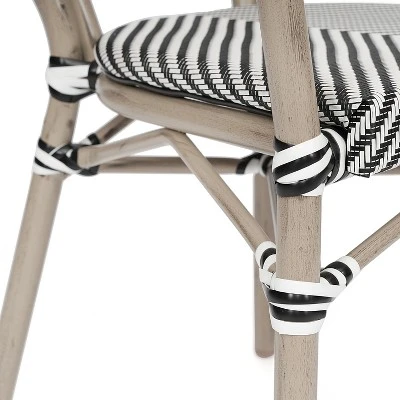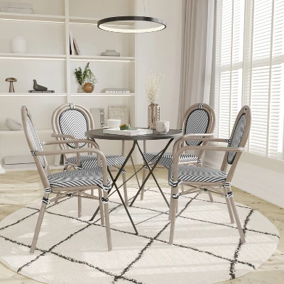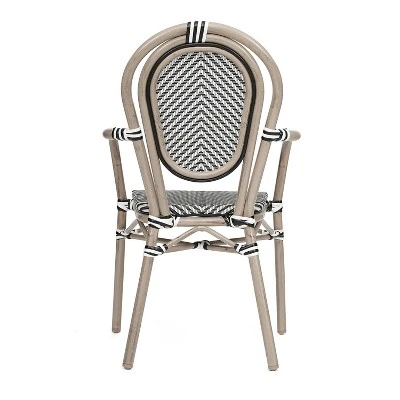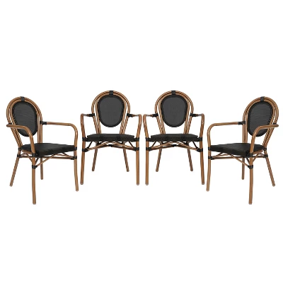 Bring the street vibes of Paris right into your restaurant, bistro, hotel, or backyard patio with this set of four indoor/outdoor commercial grade bistro chairs. The breathable textilene Thonet-style backs and seats won’t fade, provide airflow to keep guests comfortable, and aid with drying when used outdoors. The lightweight, but durable, powder coated metal frames boast a bamboo look finish available in 2 hues, hold up to 400 lbs. static weight, and will not rust. Two curved arms deliver additional comfort and structure. Recommended stack height for these chairs is up to 5 high for storage or transport. For your convenience, these chairs arrives completely assembled for instant use and features floor protector glides to prevent damage to indoor hard flooring surfaces. These dining chairs easily wipe clean with a damp cloth for quick seating turnaround.